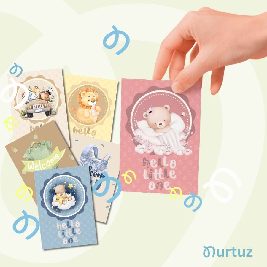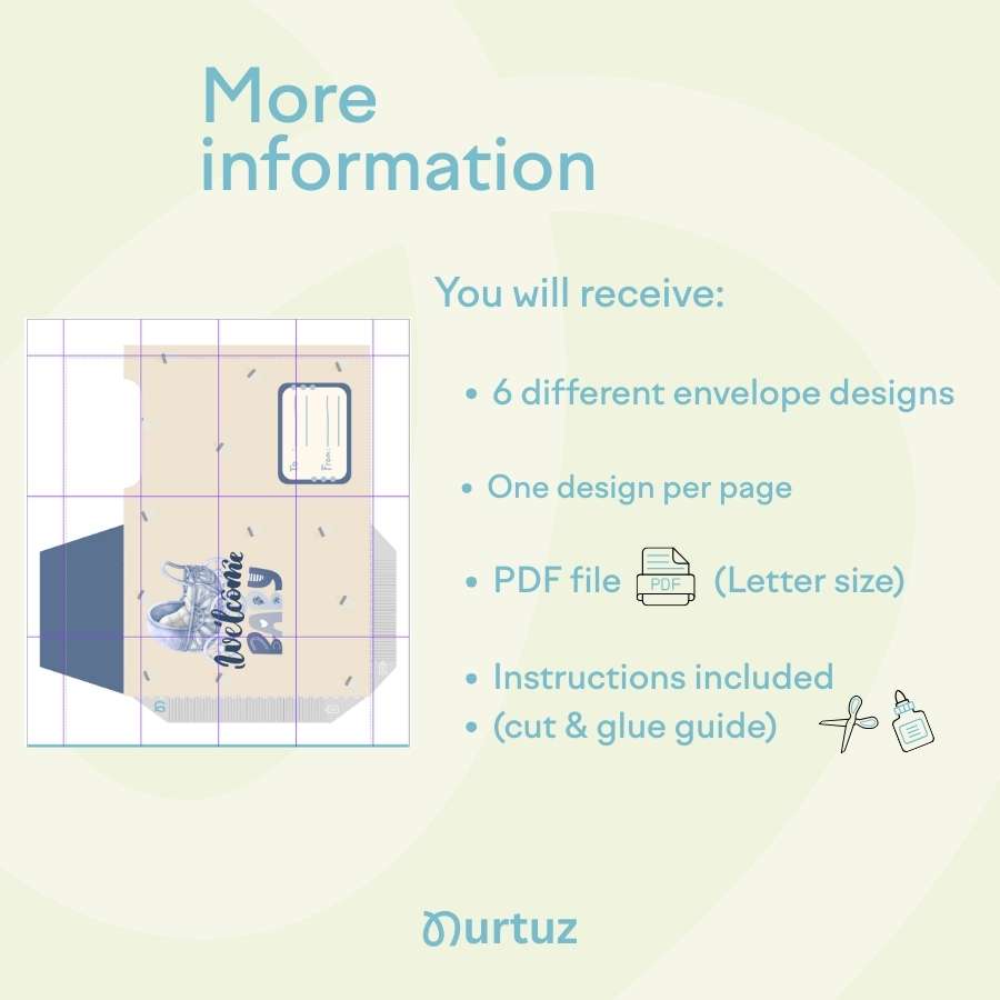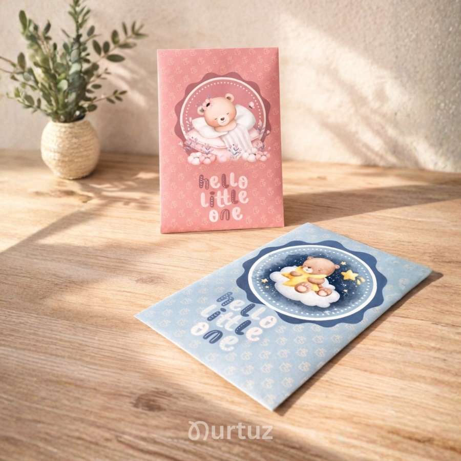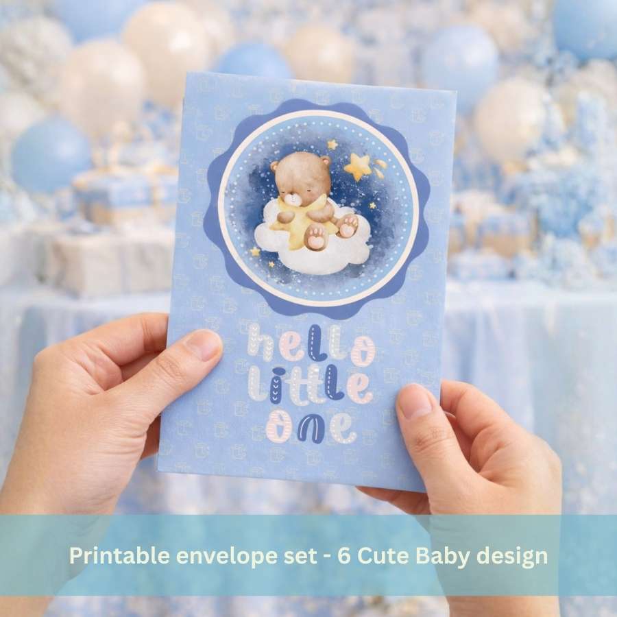 • 6 Unique Envelope Designs: Featuring charming illustrations like strollers, storks, and “Hello Little One” typography.